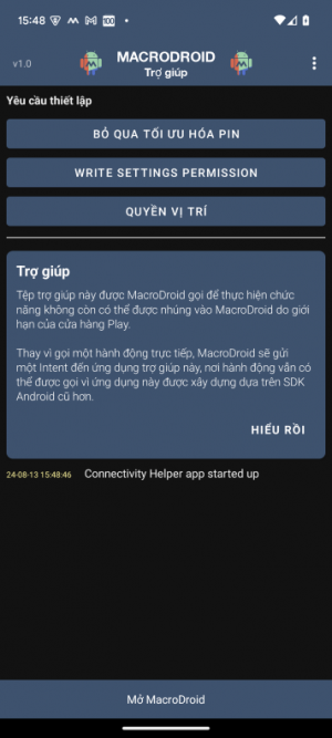 Ứng dụng Connectivity Helper hoạt động với MacroDroid phiên bản V5.47.8 trở lên và có thể tải xuống và cài đặt từ đây: https://macrodroidlink.com/connectivityhelper/MacroDroid_Connectivity_Helper.apk