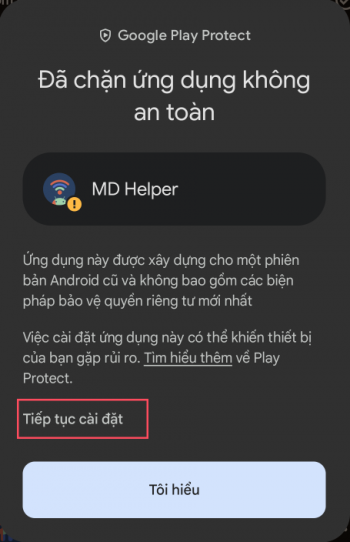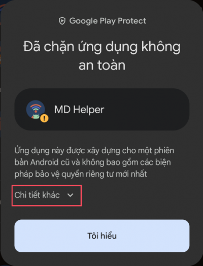 Khi cài đặt APK, bạn có thể thấy cảnh báo sau từ Google Play Protect. Trong trường hợp này, bạn chỉ cần nhấp vào nút 'Chi tiết' và chọn tùy chọn 'Vẫn cài đặt' như đã chỉ ra.
